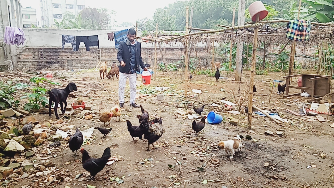 সাভারে পৌর নয়াবাড়ী এলাকায় ৫ টি মুরগীর বাচ্চা নিয়ে গড়ে তুলেছে একটি মিনি মুরগীর খামার।