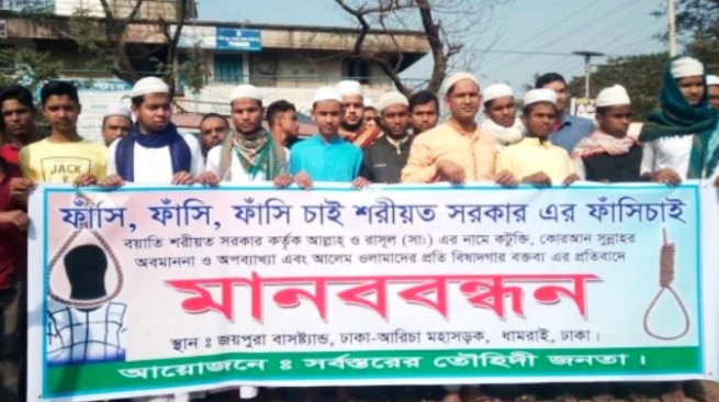 আল্লাহ ও রাসূল (সাঃ) এর নামে কটুক্তি কোরআন সুন্নাহর অবমাননা ও অপব্যাখ্যা এবং আলেম ওলামাদের প্রতি বিষাদগার বক্তব্য দেওয়ার প্রতিবাদে ধামরাইয়ের জয়পুরা বাসষ্ট্যান্ডে উপজেলা ইমাম পরিষদ, উপজেলা ইসলামি আন্দোলনসহ সর্বস্তরের তৌহিদী জনতার উদ্যোগে বয়াতি শরিয়ত সরকারের ফাঁসির দাবিতে মানববন্ধন অনুষ্ঠিত হয়েছে।