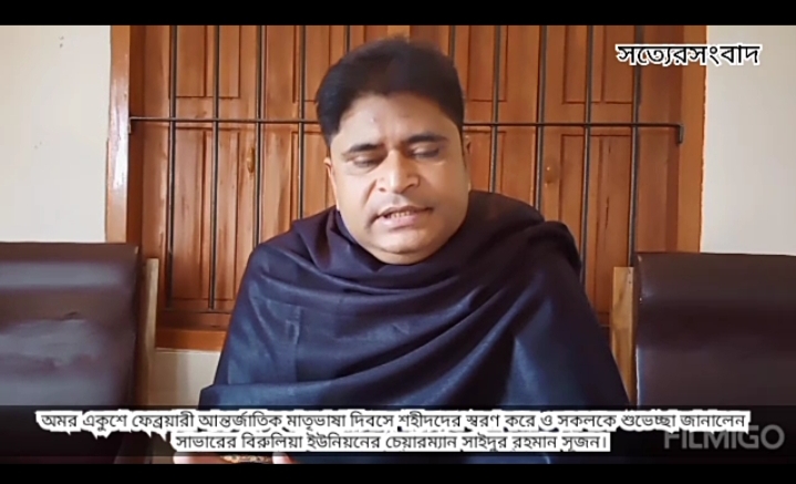 আগামী একুশে ফেব্রয়ারি শুক্রবার আন্তর্জাতিক মাতৃভাষা দিবস উপলক্ষে সাভারের বিরুলিয়া ইউনিয়নের চেয়ারম্যান সাইদুর রহমান সূজন বলেন,সালাম, বরকত,রফিকসহ যারা এ বাংলা ভাষার জন্য প্রান দিয়েছেন তাদের প্রতি শ্রদ্ধা ও সালাম জানাই। বর্তমান প্রধান মন্ত্রী জননেত্রী শেখ হাসিনার জন্য আমরা আন্তর্জাতিক ভাবে মাতৃভাষার স্বীকৃতি পেয়েছি এবং আন্তর্জাতিকভাবে এ ভাষা দিবস পালন করা হচ্ছে পৃথিবীর বিভিন্ন জায়গায়। অমর একুশে ফেব্রয়ারী আন্তর্জাতিক মাতৃভাষা দিবসে শহীদদের স্বরণ করে ও সকলকে শুভেচ্ছা জানালেন সাভারের বিরুলিয়া ইউনিয়নের চেয়ারম্যান সাইদুর রহমান সূজন।