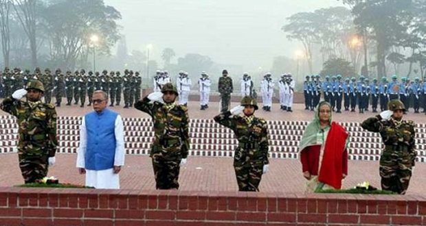 সূর্যোদয়ের সাথে সাথে মহান বিজয় দিবসে জাতীয় স্মৃতিসৌধে বীর শহীদদের প্রতি ফুল দিয়ে শ্রদ্ধা জানিয়েছেন রাষ্ট্রপতি মো. আবদুল হামিদ ও প্রধানমন্ত্রী শেখ হাসিনা। সোমবার সকাল ৬টা ৩৪ মিনিটে জাতীয় স্মৃতিসৌধে ফুল দিয়ে শ্রদ্ধা নিবেদন করেন রাষ্ট্রপতি ও প্রধানমন্ত্রী।বীর শহীদের প্রতি শ্রদ্ধা জানিয়ে জাতীয় স্মৃতিসৌধে পুষ্পস্তবক অর্পণের পর কিছুক্ষণ নিরবে দাঁড়িয়ে থাকেন রাষ্ট্রপতি ও প্রধানমন্ত্রী।এ সময় বিউগলে বাজানো হয় করুণ সুর। শহীদের প্রতি শ্রদ্ধা জানিয়ে গার্ড অব অনার প্রদান করে সশস্ত্র বাহিনীর একটি চৌকস দল।