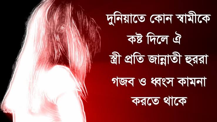 কোন মহিলা তার স্বামীকে দুনিয়াতে কষ্ট দিলে তার জান্নাতী অপরূপা সুন্দরী স্ত্রী তথা ’হূররা সে মহিলাকে তিরস্কার করতে থাকে।