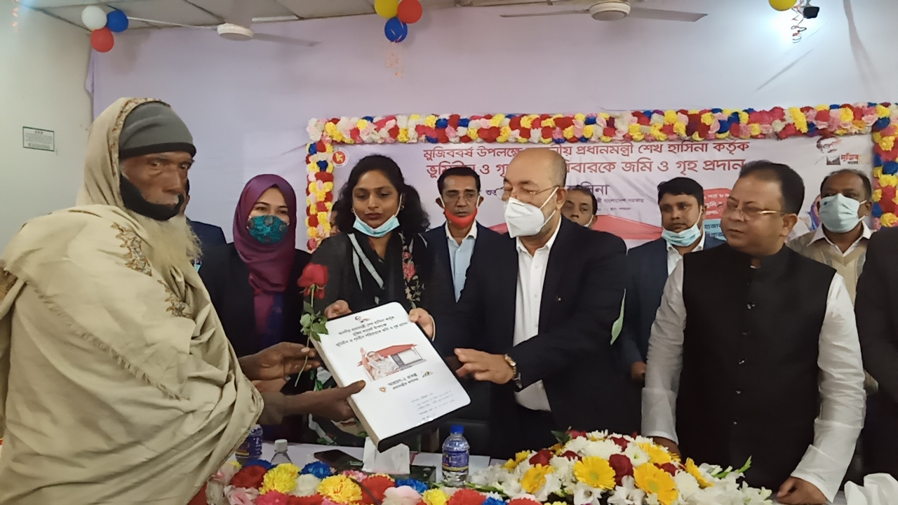 সাভারে ৪২০ জন গৃহহীন পরিবারের মধ্যে ৪১ জন পরিবারকে জমি ও ঘরের দলিল বুঝিয়ে দেন অতিথিগন।