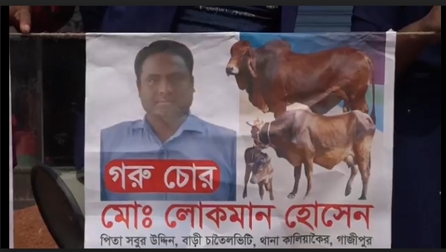 সকালে আশুলিয়ার কবিরপুরের তেলীবাজার এলাকায় স্থানীয় লোকমান হোসেন নামের এক ব্যবসায়ীকে গরু চোর অখ্যায়িত করে ব্যানার ফেস্টুন হাতে নিয়ে কয়েক’শ এলাকাবাসী মানববন্ধন ও বিক্ষোভ মিছিল করেন। মানববন্ধনে এসময় নারী পুরুষ শিশুসহ সমাজের সর্বস্তরের মানুষজন অংশ গ্রহণ করেন।