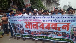 সাভার পৌর ছাত্রলীগের সভাপতিসহ আসামীদের গ্রেফতাররের দাবীতে মানববন্ধন ও বিক্ষোভ মিছিল