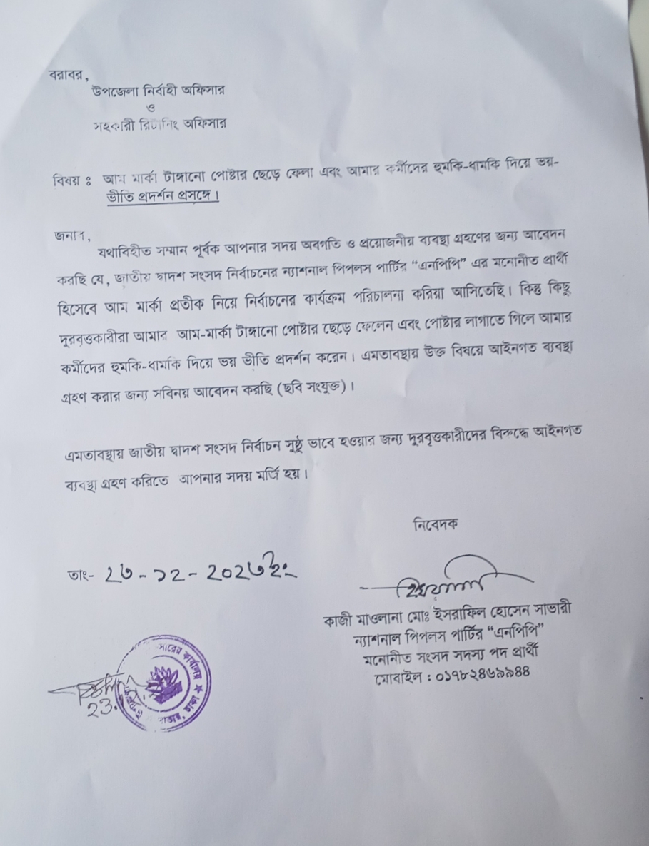 ন্যাশনাল পিপলস পার্টি সাভার সংসদীয় আসনের প্রার্থী কাজী মাওলানা মো: ইসরাফিল হোসেন সাভারী তার টাঙ্গানো পোস্টার ছিড়ে ফলাসহ বিভিন্ন ভাবে কর্মীদের হুমকি ধামকি দেয়ায় নাম উল্লেখ না করে শনিবার সকালে একটি লিখিত অভিযোগ দায়ের করেছেন সাভার উপজেলা নির্বাচনী সহকারী রিটার্নিং কার্যালয় বরাবর।