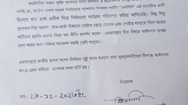 সাভার সংসদীয় আসনে পোষ্টার ছিড়ে ফেলা ভয়ভীতি প্রদর্শন করায় দুষ্কৃতকারীদের বিরুদ্ধে লিখিত অভিযোগ এনপিপি’ র শেখ এ কে আজাদ,নিজস্ব প্রতিবেদক,সাভার থেকে: দ্বাদশ জাতীয় সংসদ নির্বাচনে ঢাকা- ১৯ সাভার-আশুলিয়া আসনের সংসদীয়