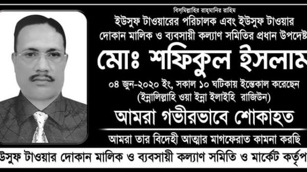 –শোক সংবাদ- সুগন্ধা সুপার মার্কেটের মালিক শফিকুল ইসলাম সফির মৃত্যু দৈনিক ভোরের কাগজ প্রতিবেদক মো: আজিম উদ্দিনের ভগ্নিপতি আলহাজ শফিকুল ইসলাম সফি পিতা মরহুম গর্জন আলী ৪ জুন বৃহস্পতিবার সকাল