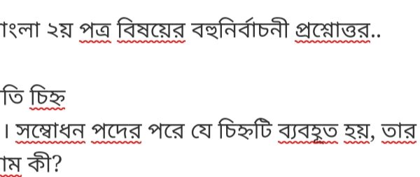 বাংলা ২য় পত্র বিষয়ের বহুনির্বাচনী প্রশ্নোত্তর.. যতি চিহ্ন ১। সম্বোধন পদের পরে যে চিহ্নটি ব্যবহূত হয়, তার নাম কী? ক. দাঁড়ি খ. কোলন গ. সেমিকোলন ঘ. কমা ২। বিরামচিহ্ন কেন