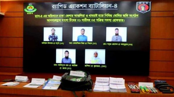 শেখ এ কে আজাদ,সাভার থেকেঃ ঢাকা জেলার আশুলিয়া ও ধামরাই থেকে নিষিদ্ধ ঘোষিত জঙ্গি সংগঠন আনসারুল্লাহ বাংলা টিমের এক নারীসহ ৫ সদস্যকে আটক করেছে র্যাপিড এ্যাকশন ব্যাটালিয়ন (র্যাব)। এসময় তাদের